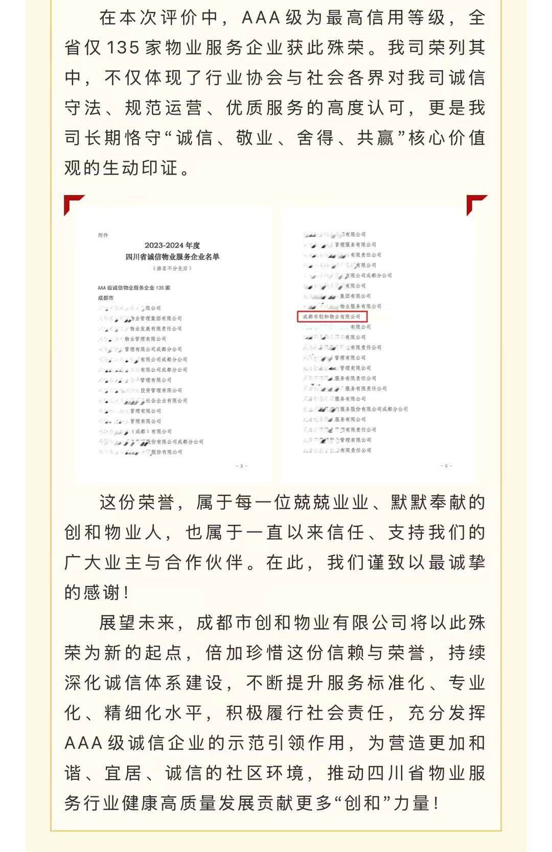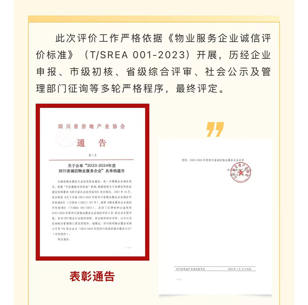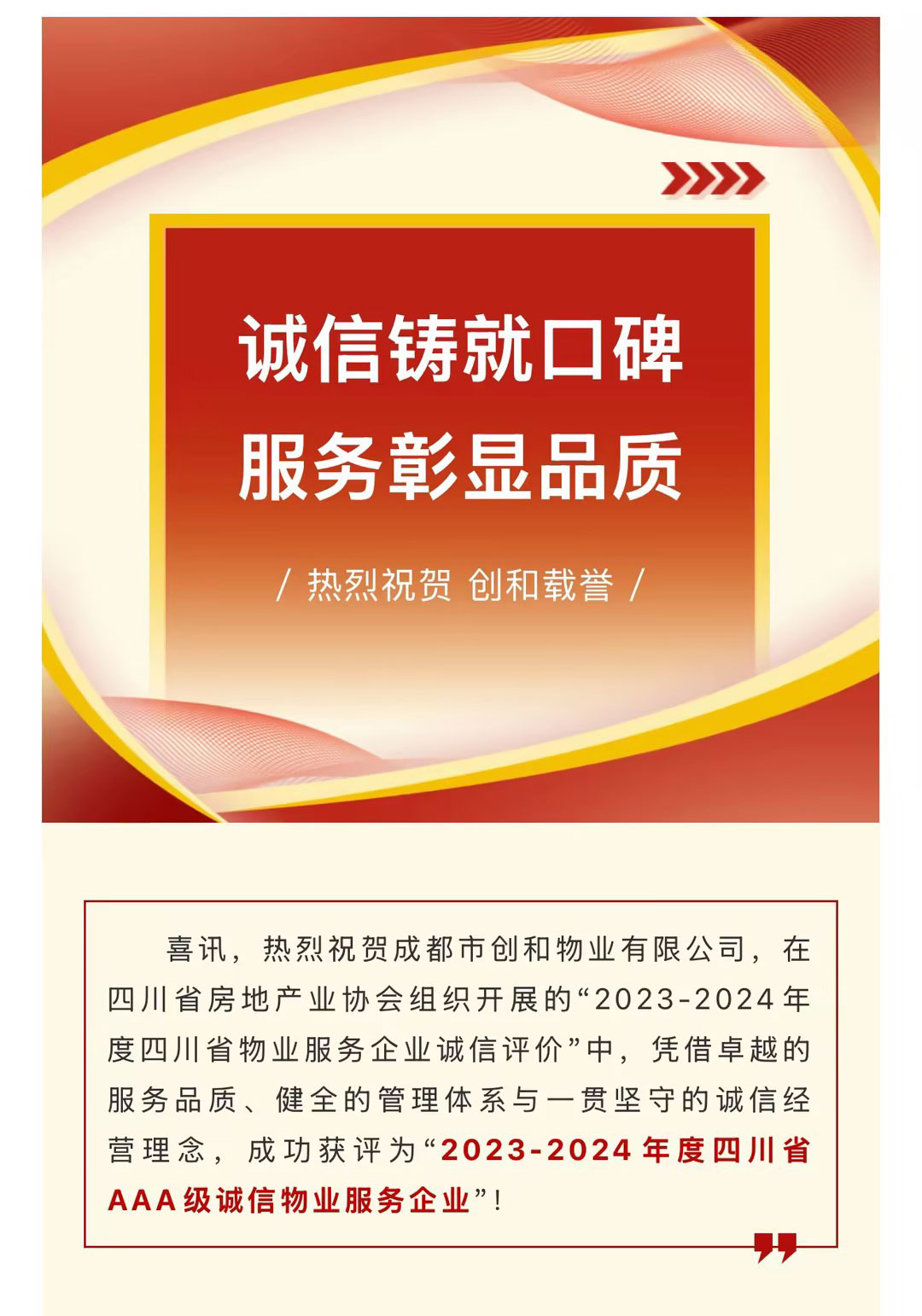 喜讯,热烈祝贺成都市创和物业有限公司,在四川省房地产业协会组织开展的“2023-2024年度四川省物业服务企业诚信评价”中,凭借卓越的服务品质、健全的管理体系与一贯坚守的诚信经营理念,成功获评为“2023-2024年度四川省AAA级诚信物业服务企业”!