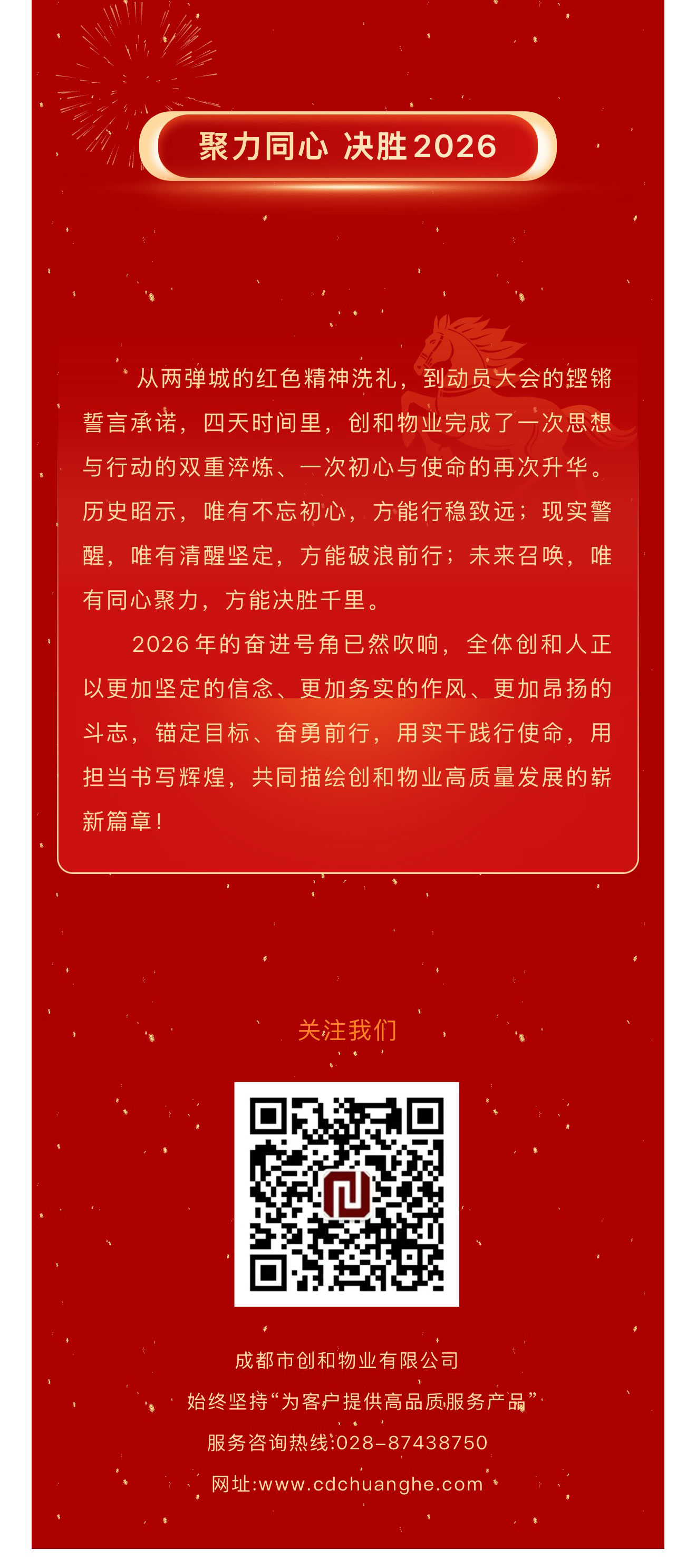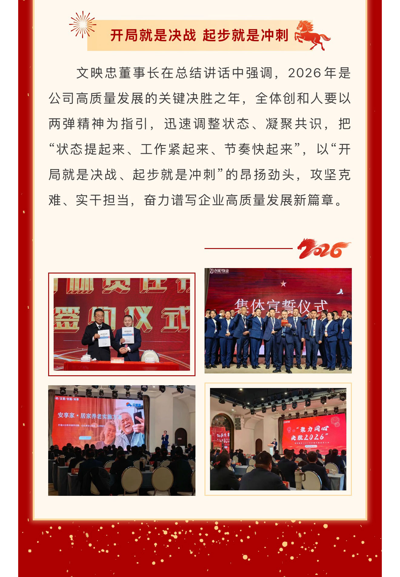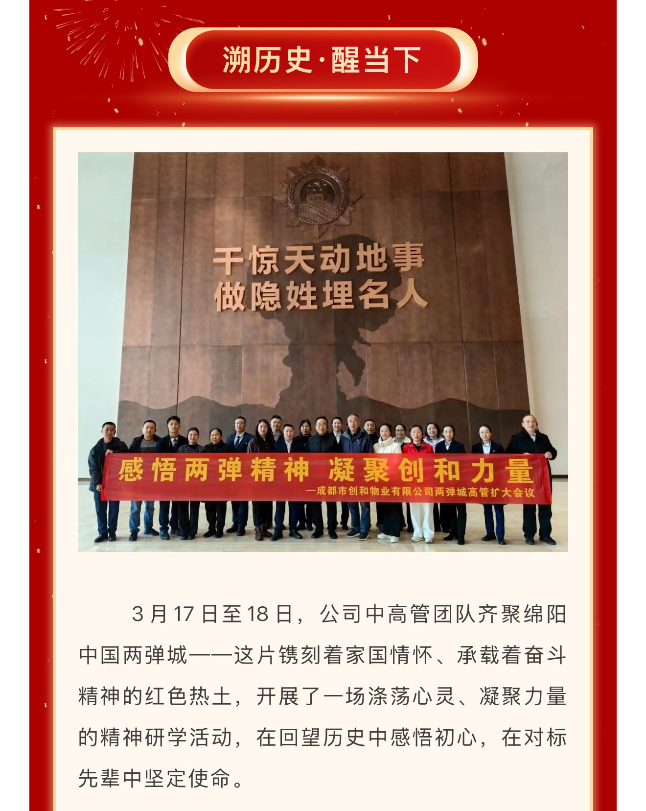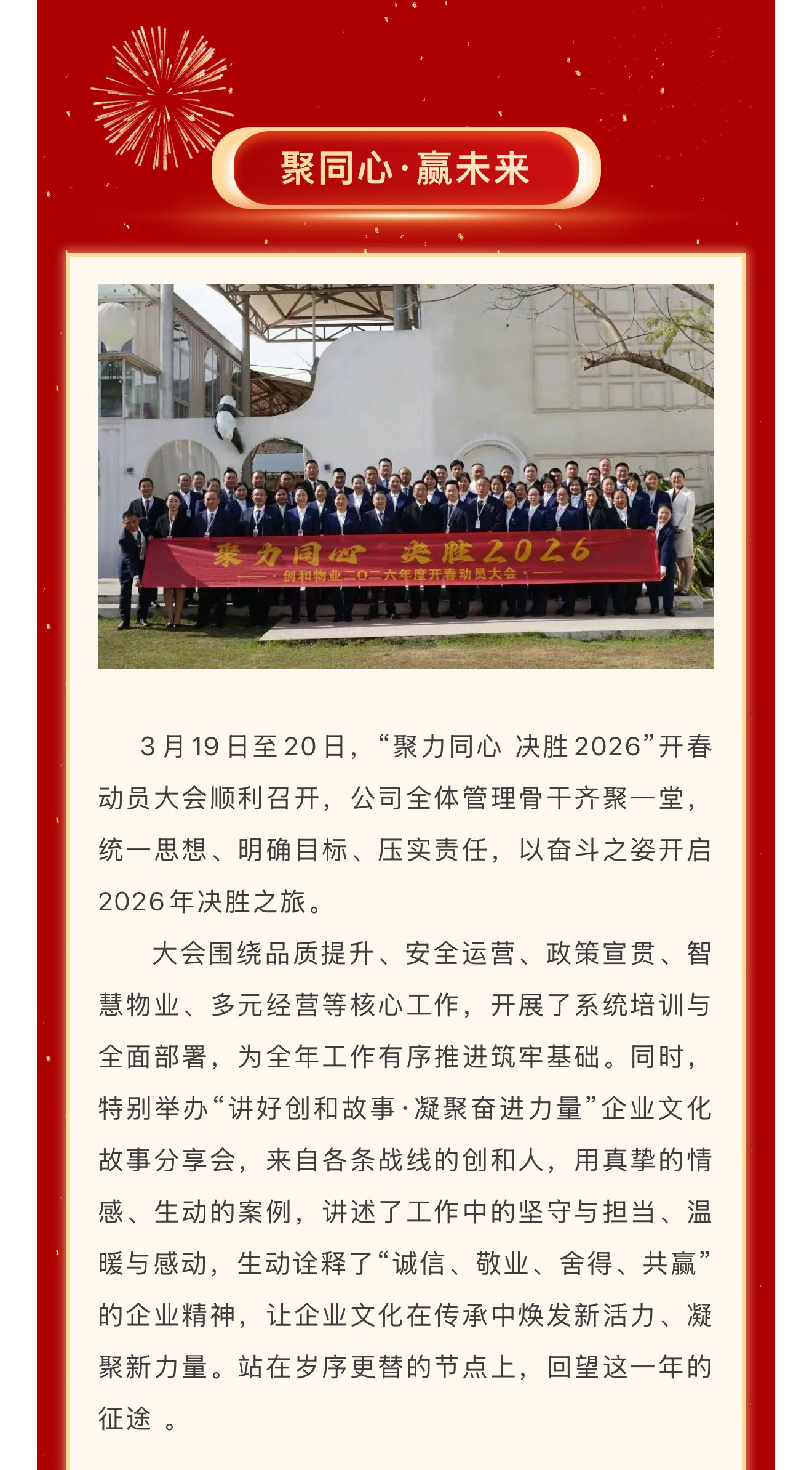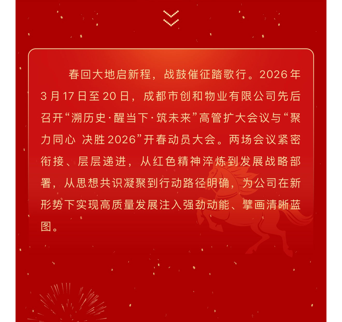 春回大地启新程,战鼓催征踏歌行。2026年3月17日至20日,成都市创和物业有限公司先后召开“溯历史·醒当下·筑未来”高管扩大会议与“聚力同心 决胜2026”开春动员大会。两场会议紧密衔接、层层递进,从红色精神淬炼到发展战略部署,从思想共识凝聚到行动路径明确,为公司在新形势下实现高质量发展注入强劲动能、擘画清晰蓝图。