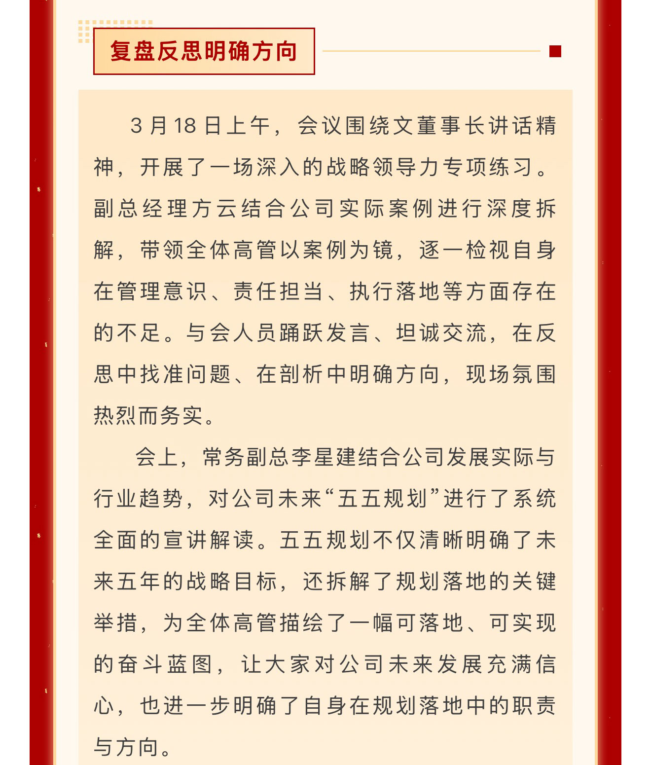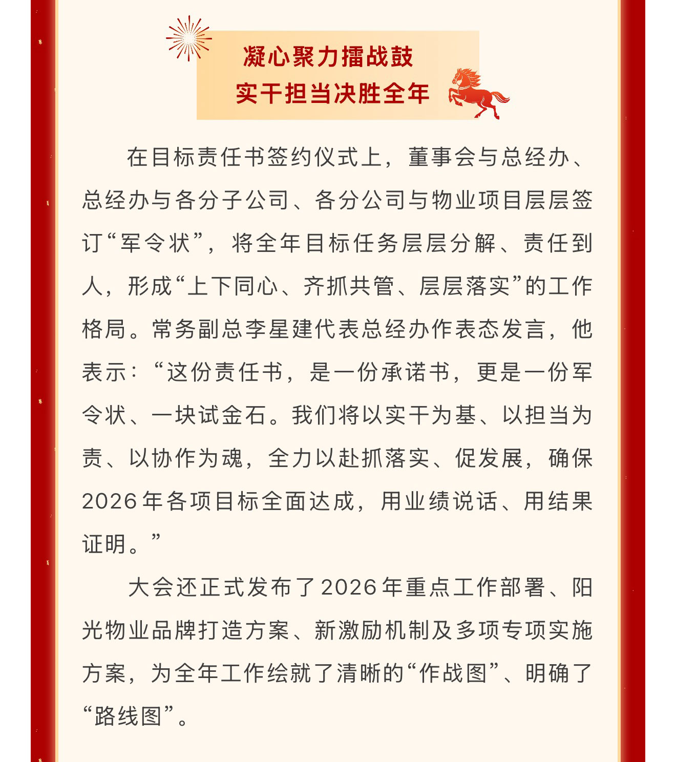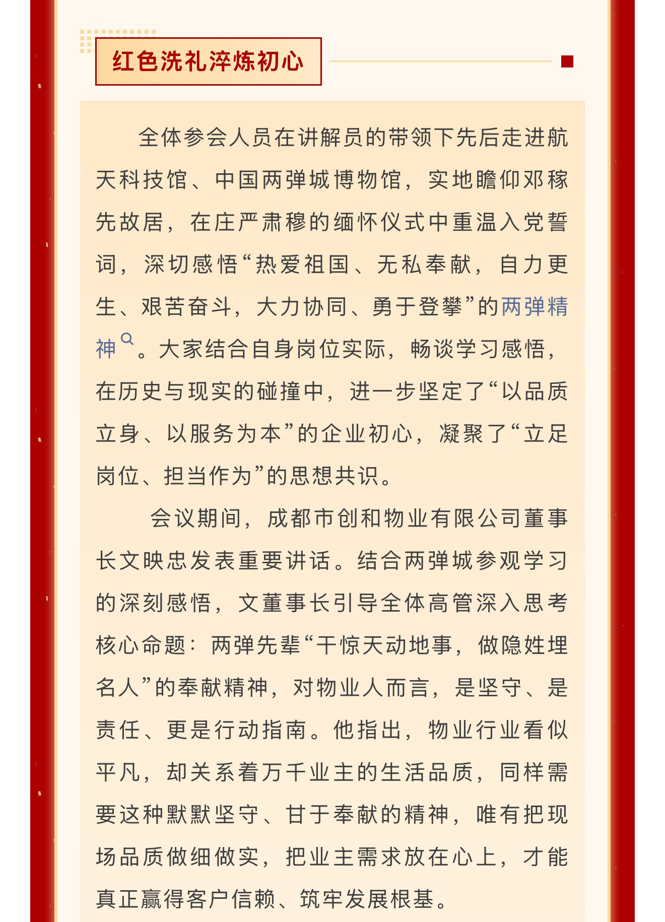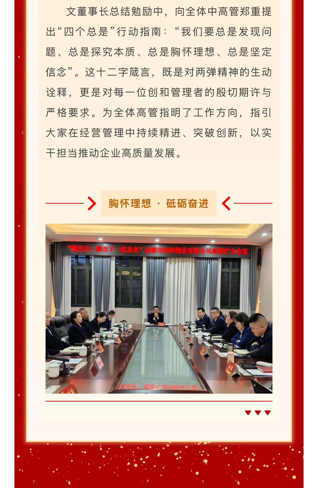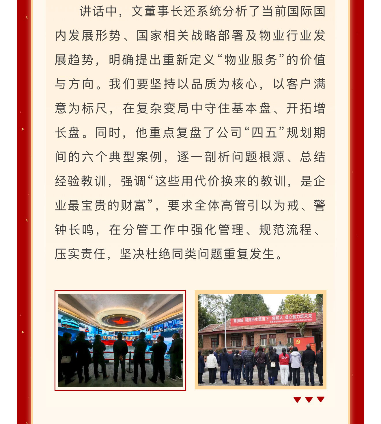 春回大地启新程,战鼓催征踏歌行。2026年3月17日至20日,成都市创和物业有限公司先后召开“溯历史·醒当下·筑未来”高管扩大会议与“聚力同心 决胜2026”开春动员大会。两场会议紧密衔接、层层递进,从红色精神淬炼到发展战略部署,从思想共识凝聚到行动路径明确,为公司在新形势下实现高质量发展注入强劲动能、擘画清晰蓝图。